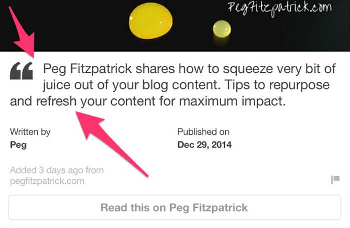 Another cool new feature for Rich Pins is the larger quote graphic that displays from your description field. This is a relatively new update to the mobile app so you may need to update the app on your device if you can’t see this feature.