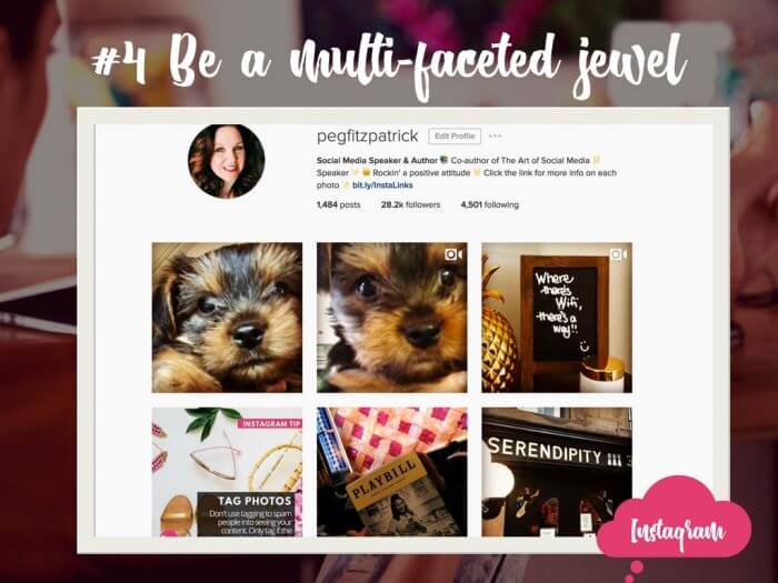 Be a multi-faceted jewel by sharing personal information and business information in a mix that works for you and feel comfortable. A gem role model is Arianna Huffington, who shares some of her travels and personal photos but doesnโt go overboard with minute personal details. I think if you look around, youโll see that many successful people have a balance which is my goal as well.