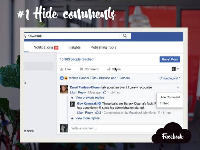 Guy says, “I don’t care who comments on my posts. There’s no such thing as too much engagement. I just “hide” the stuff that I don’t like. When you do so, the commenter and his/her followers can still see it, so they think you haven’t deleted it.”